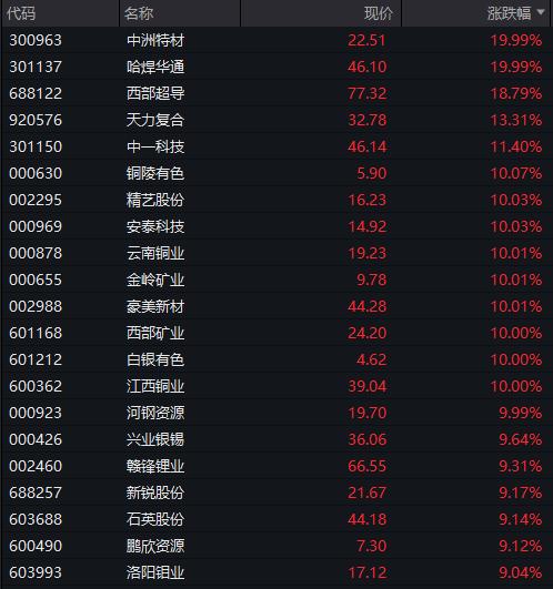 有色金属股集体爆发,中州特采、哈焊华通20CM涨停,西部超导、天力复合等纷纷走高。