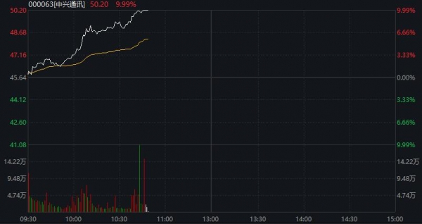 A股中兴通讯盘中触及涨停,成交额超100亿元;港股中兴通讯涨超10%。