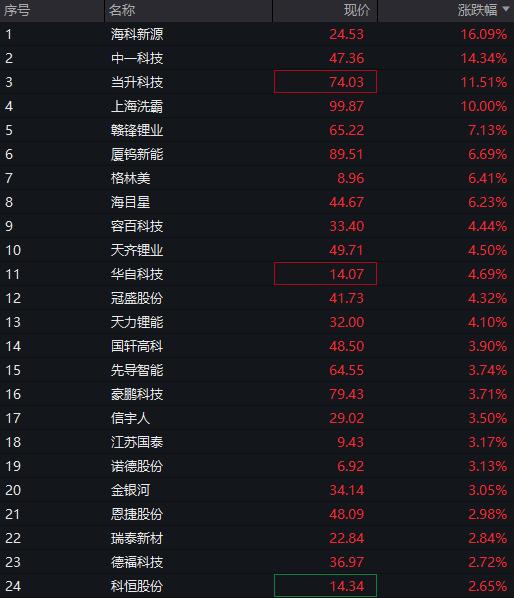 A股固态电池概念股震荡走强,上海洗霸涨停,当升科技、海科新源、中一科技涨超10%,赣锋锂业、天际股份跟涨。