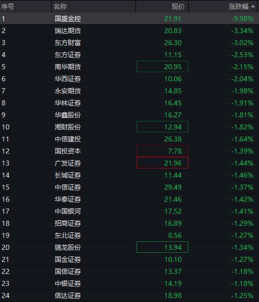 A股证券板块走弱,国盛金控跌停,东方证券、湘财股份、华西证券、中信建投多股下挫。
