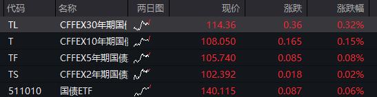 国债期货涨幅扩大,30年期主力合约涨0.33%,10年期主力合约涨0.16%,5年期主力合约涨0.09%,2年期主力合约涨0.02%。