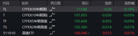国债期货开盘,30年期主力合约跌0.18%,10年期主力合约跌0.03%,5年期主力合约跌0.05%,2年期主力合约跌0.01%。