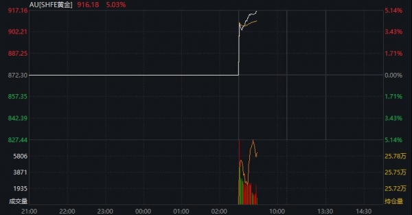 沪金期货主力合约日内涨幅扩大至5%,续创新高。