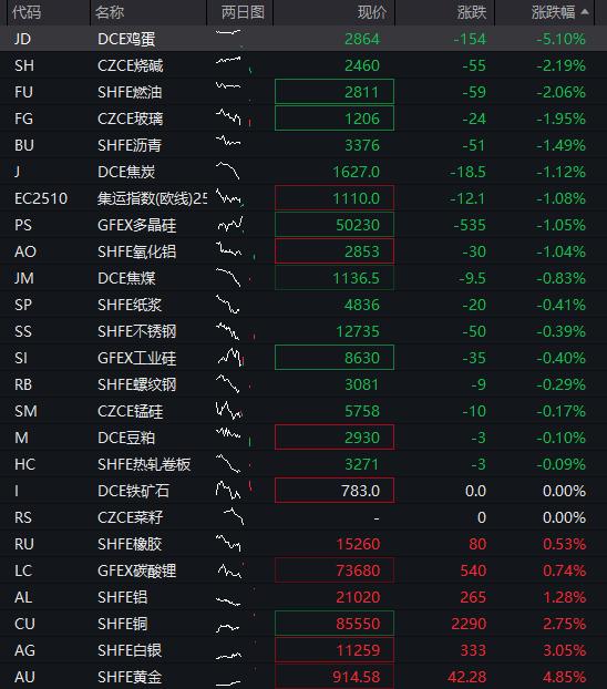 国内期货主力合约开盘涨跌互现,沪金涨超4%,棕榈油、沪银涨超2%;跌幅方面,生猪、鸡蛋、液化石油气(LPG)跌超4%,集运欧线、低硫燃料油(LU)跌超2%。
