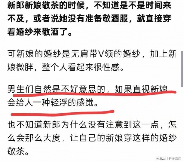 事件迅速在网络发酵,形成鲜明对立的观点阵营。支持者认为"穿衣是个人自由,他人无权干涉",主张婚礼应突破传统束缚;反对者则强调,敬茶并非拍照秀场,而是象征家族联结的庄重仪式,"站着递茶、坐着接茶的距离里,衣服太露会让双方都不自在"。
