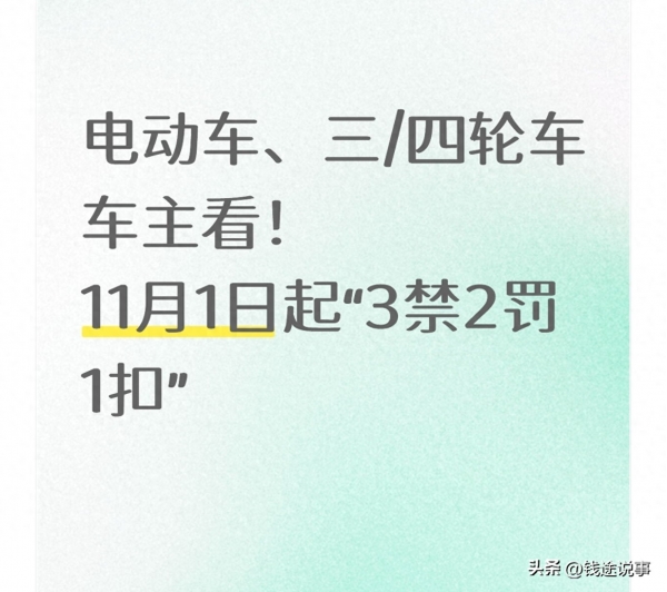 11月1日就是个重要日子!全国多地针对电动车、电动三轮车、四轮车(包括老年代步车)的"3禁2罚1扣"新规正式执行,不少人还不清楚具体要求,万一不小心违规,不仅要罚款,车可能还会被扣。