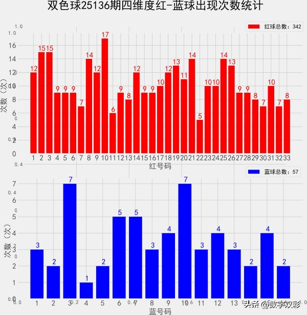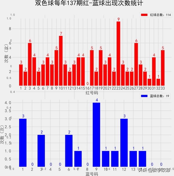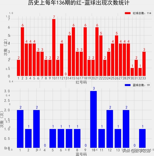 统计每年136期的样本数据:114个红球 19个蓝球
