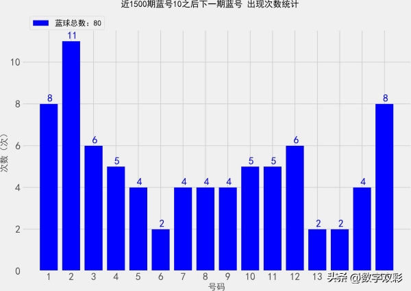 统计近1500期蓝号10之后, 各蓝球的出现次数