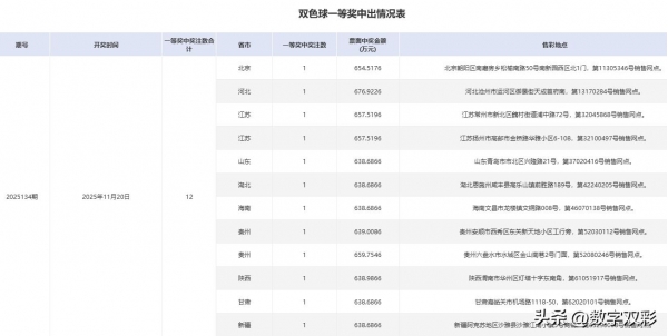 双色球25134期一等奖中奖详情