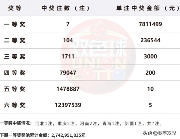 红球号和值74,蓝球10,7注一等奖,奖池27.43亿(2742951835)。