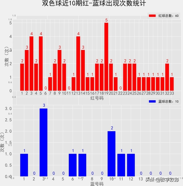 双色球近10期红蓝号统计情况