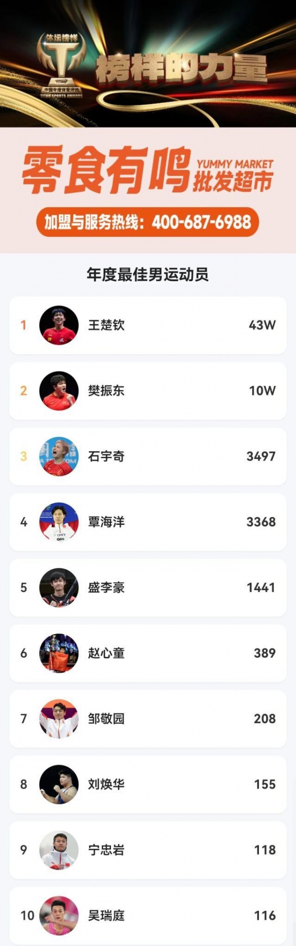 经过为期15天(12月1日至12月15日)的火热投票,2025体坛榜样年度评选大众评选环节圆满落幕。本次评选吸引了来自全国各地的广大体育爱好者、粉丝及社会公众的踊跃参与,累计收到有效投票逾263万份,生动展现了中国体育深厚的群众基础与社会影响力,也成为了一次全民共享、互动参与的体育文化盛事。在此,特别感谢硬折扣连锁零售行业头部企业"成都零食有鸣商业管理有限公司"(旗下品牌:零食有鸣批发超市+零食有鸣+零食有鸣便利)对本届体坛榜样年度评选的大力支持!