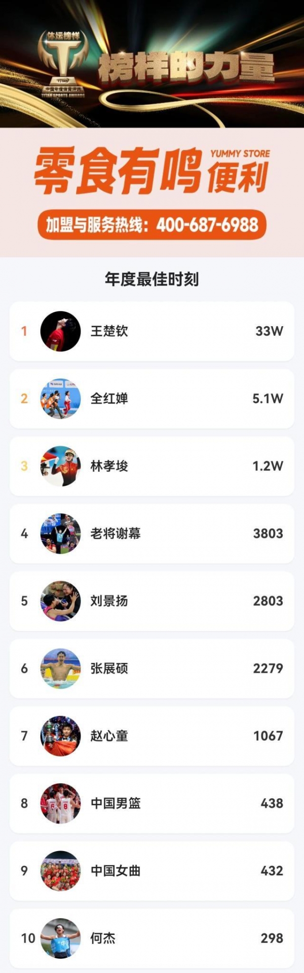 大众评选年度最佳时刻奖项,王楚钦以33万票夺魁,全红婵、林孝埈紧随其后,这些"高光瞬间"凝结了运动员奋斗的汗水与梦想的闪光,也成为体育精神传播的生动载体。