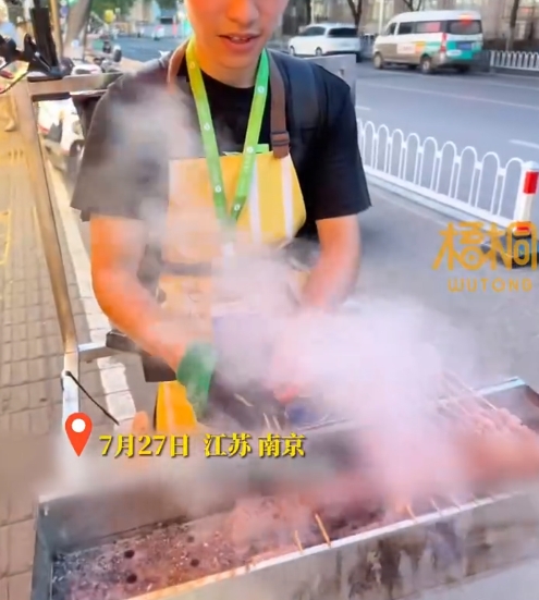 7月27日,江苏南京。网友街头偶遇小哥路口卖烤串,不锈钢烤架直接背在身上,走哪卖哪,整个人就是一个移动烧烤摊,新奇一幕吸引路人的注意。当事人王先生称根据兴趣创业,自己画图纸让人帮忙打造的烧烤架,平时没有固定摊位,走到哪算哪,虽然很累但是也锻炼了自己。