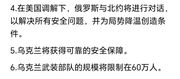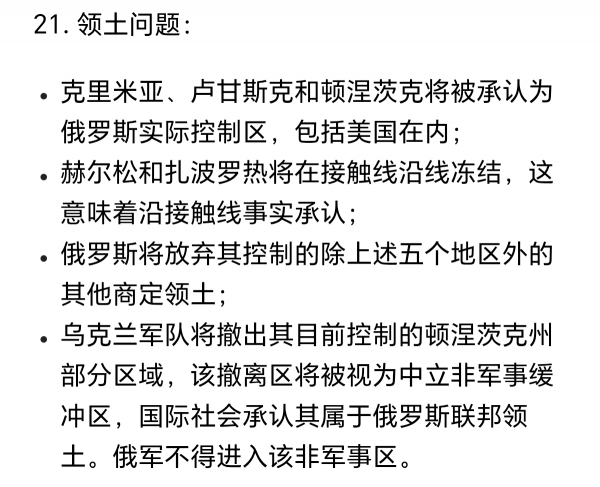 前面说实际控制区、俄罗斯领土,后面说是非军事缓冲区,俄军不得进入。这不就是印巴的克什米尔、俄日的北方四岛吗?开始的时候,拉多国给乌克兰捐钱送武器,全面制裁俄罗斯。现在乌克兰弹尽人疾了,怕乌克兰彻底溃败,到那时候,给乌克兰的战争"投资",一分都要不回来。所以,用认输的方式逼乌克兰投,诱普京停战。这种小把戏能麻痹普京吗?