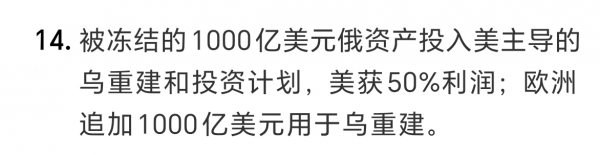 真不知道什么样的人,才能不要脸到这个程度。明明是"抢夺"1000亿美元俄资产,还厚颜无耻的说,用来主导投资乌重建和投资计划,一句话就顺理成章拿走50%的利润。最搞笑的是,发现亏了50%,又来一句,欧洲追加1000亿美元用于乌重建,又拿回50%,1000亿收入囊中。这样,事情办好了、钱1分没少,还合理合法变为己有。只能说,特朗普不愧是马斯克都甘拜下风的商人,这招确定无人能敌。