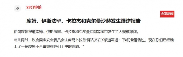 以上是以色列和伊朗双方接下来可能会采取的动作,目前有关伊朗和以色列的消息还在持续更新。当笔者写到这里的时候,伊朗国际的后续报道宣称,伊朗多个城市听到爆炸声,这包括霍拉马德、洛雷斯坦、克尔曼沙和大不里士。而一名美国官员确认,美国对伊朗的攻击正在进行,目标是摧毁伊朗的安全机构,说的直白一点就是瓦解伊朗的军事防御和进攻能力。