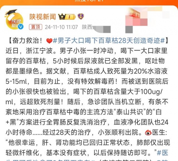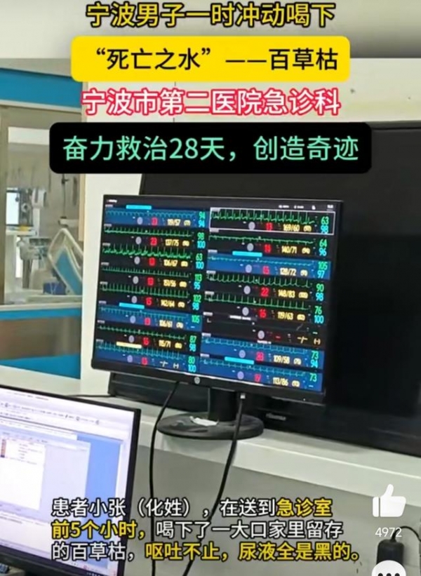 11月10日有媒体报道,近日浙江宁波,男子小张一时冲动,喝下了一大口家里留存的百草枯。