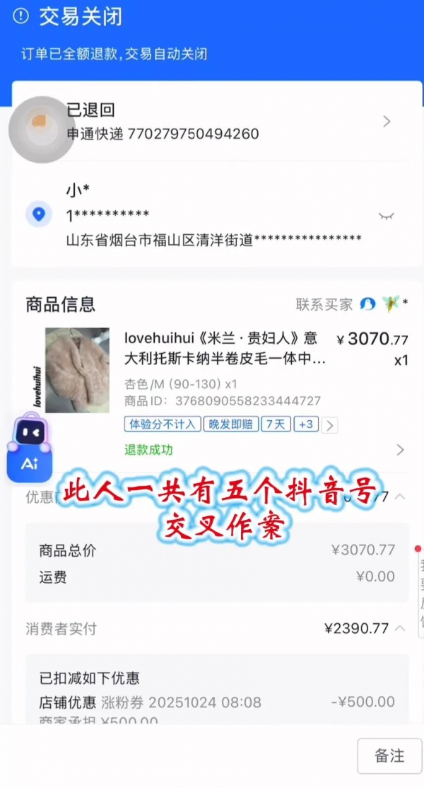 时女士于是就赶紧梳理订单,这才发现近半年以来,有225单退款的收货地址、关联账号全都一样。