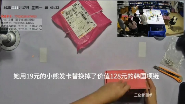 而这事儿的暴露,纯属是一个巧合,12月初她又下单了一件899元的羽绒服和39元的棉袜,调包时面单没有贴实,翘起了一角。