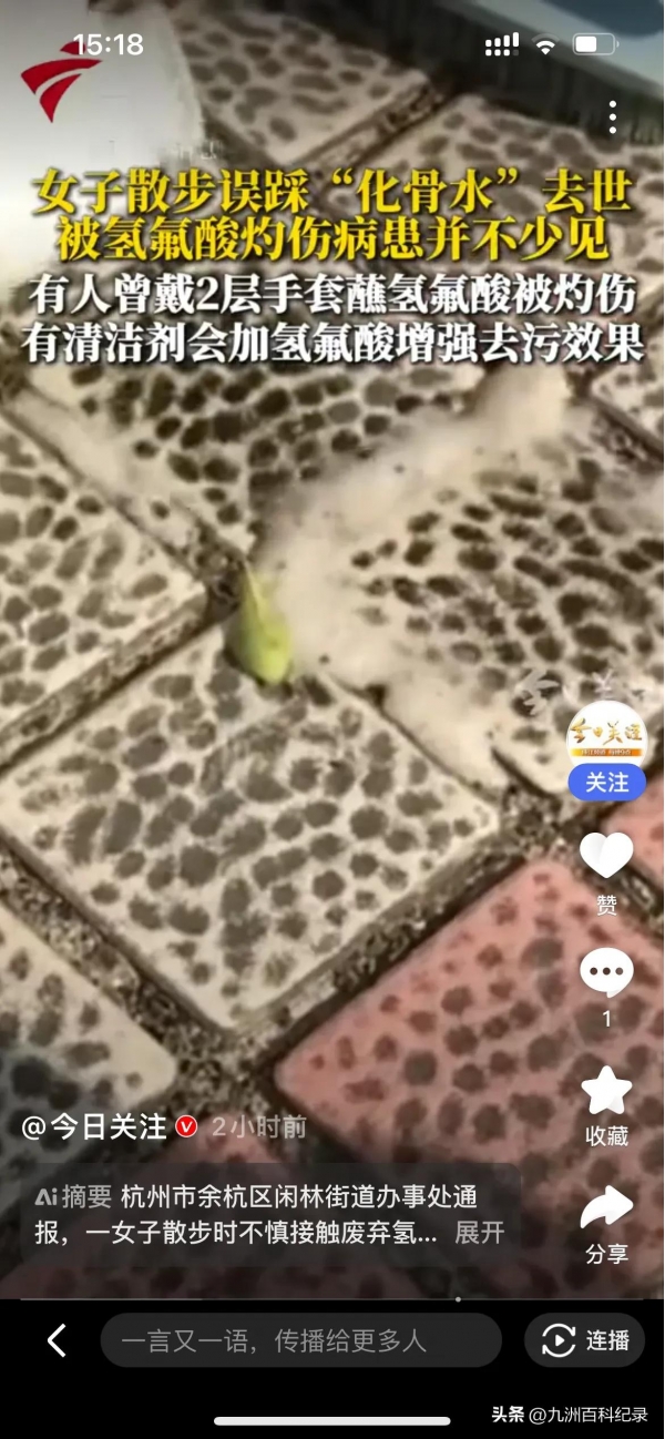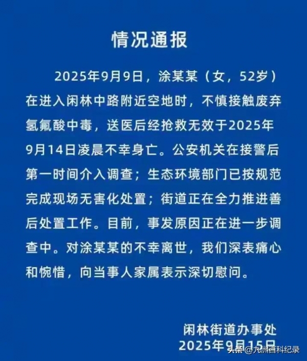 2025年9月9日上午,杭州52岁女子涂某某进入闲林中路附近空地时,不慎接触废弃氢氟酸中毒。送医后经抢救无效,她于9月14日凌晨不幸身亡。
