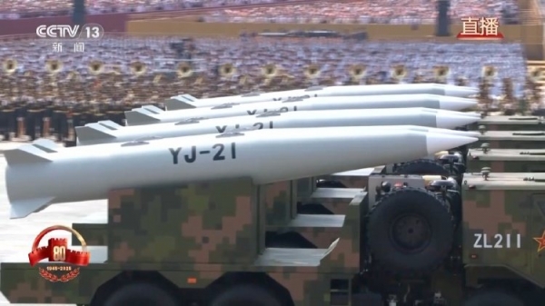 以快制强,极速打击。受阅的鹰击-21、东风-17、东风-26D导弹,飞行速度快,突防能力强,命中精度高,是具备全天候作战能力的新型杀手锏。