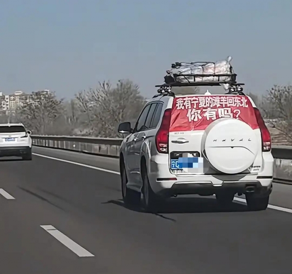 姜女士是宁夏吴忠人,嫁到黑龙江大庆那边,每年春节前都会回老家买滩羊带过去,今年她和妹妹一家一起出发,两辆车总共买了4只羊,其中一只直接绑在车顶上,还挂了一条横幅写着"我有宁夏的滩羊回东北,你有吗",这件事在2月10日中午被人拍下来,第二天就在短视频平台上火了。