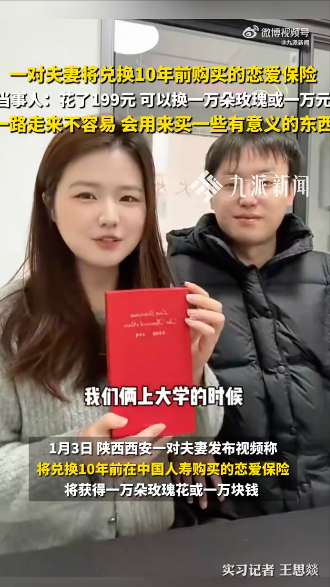 1月3日,陕西西安一对夫妻发布视频称,将兑换10年前在中国人寿购买的恋爱保险,将获得一万朵玫瑰花或一万块钱。