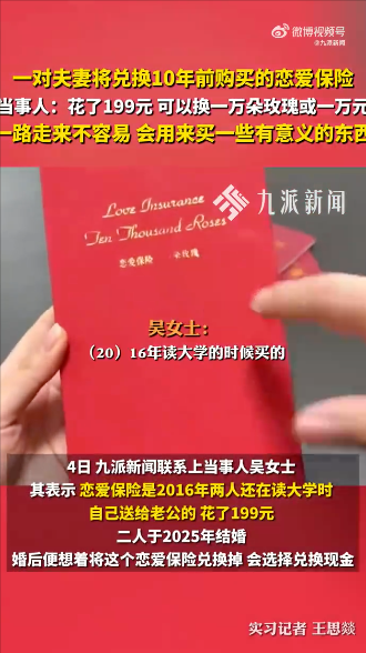 吴女士老公王先生称,这份恋爱保险跟着自己走过了四五个城市,走到哪里都带在身边,就是怕弄丢了。其称,自己已于昨日与中国人寿通话,2到3个工作日以内会发邮件,需要提供身份证、结婚证等相关信息。