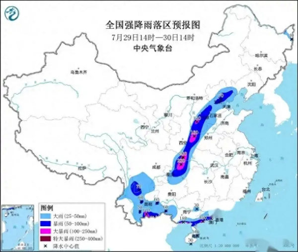 7月29日,中央气象台发布了暴雨橙色预警,预计河北中南部和东北部、北京、天津、辽宁西南部等地有大到暴雨,局地有大暴雨。