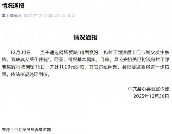 12月30日23时53分,山西襄汾县委宣传部发布情况通报,针对通过网络反映"山西襄汾一包村干部酒后上门与其父发生争执,致使其父受伤住院"一事做出回应: