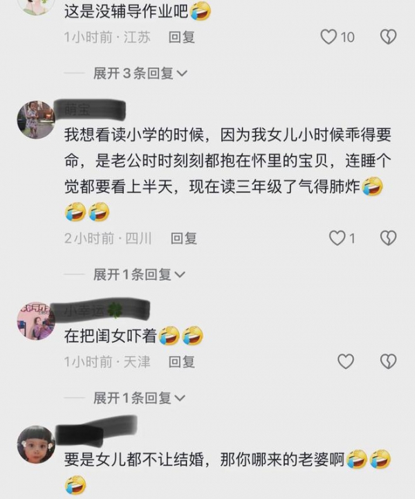 还有网友说,很多男人都有这样的纠结,喜欢要女儿,却又害怕女儿嫁出去。看来生个女儿对于男人来说,是一种焦虑。看吧,女儿这么小就开始焦虑了,要焦虑很多年呢。