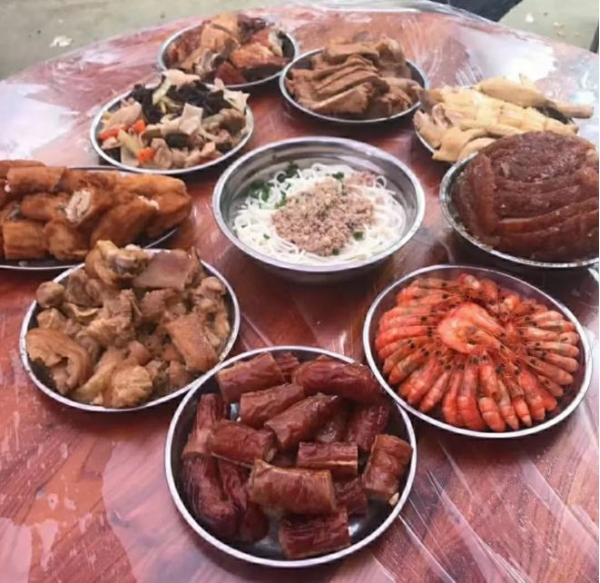 随礼20块,一桌20道菜品,全都是硬菜,只有一个蔬菜,如果桌子上的菜品不够打包,主人家还需要另外添加菜品,直到每个参加宴席的村民们都能够打包带回家为止。