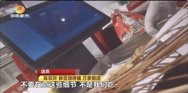 该工作人员的行为不仅与门店宣称的"鲜货不隔夜"背道而驰,还将早已解冻的肉串又重新收回冰柜冷藏。