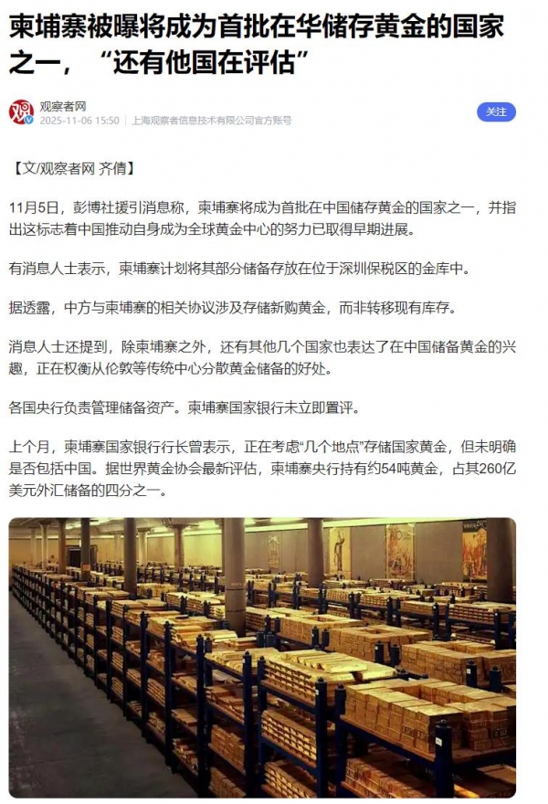 现行的国际金融体系,是以美西方为核心的。毕竟,美国有"美元霸权",全球贸易大部分都采用美元作结算货币。因此,各国央行的黄金储备,也基本存放在几个西方金库中,尤其是美国,在2024年黄金储量高达8133.46吨,这就是给"美元霸权"的信任做背书。但现在,情况在悄然改变。在2023年,马来西亚总理安瓦尔就提议,建立"亚洲货币基金组织",增加应对经济危机、摆脱西方金融影响的能力。现在,彭博社又透露,柬埔寨计划把黄金存放在中国,还有多个国家准备响应。目前,柬埔寨央行有54吨黄金,他们准备存放在上海黄金交易所(SGE)在深圳保税区的金库。