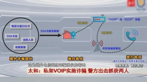 太和县公安局刑侦大队 直属中队指导员 于胜翰:藏匿在境外的电信网络诈骗团伙通过远程操控的方式,使用搭建在境内的"VOIP"设备向受害人拨打电话,不仅褪去了"00"开头的外衣,降低被害人的防范意识,还能帮助诈骗分子隐藏身份、逃避打击,实现"人机分离"。