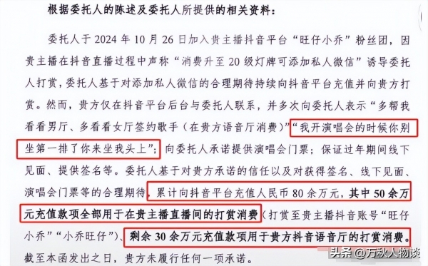 最终这场失败的消费体验,不可避免地走向了法庭上的"退货与索赔",榜一大哥委托律师,发出了一份措辞严厉的律师函,这份文件与其说是法律声明,不如说是一份正式的"退货申请",它直指卖家虚构事实、诱导消费,涉嫌构成诈骗,要求对方在五日内全额退还80万元打赏款,否则就正式启动司法程序。