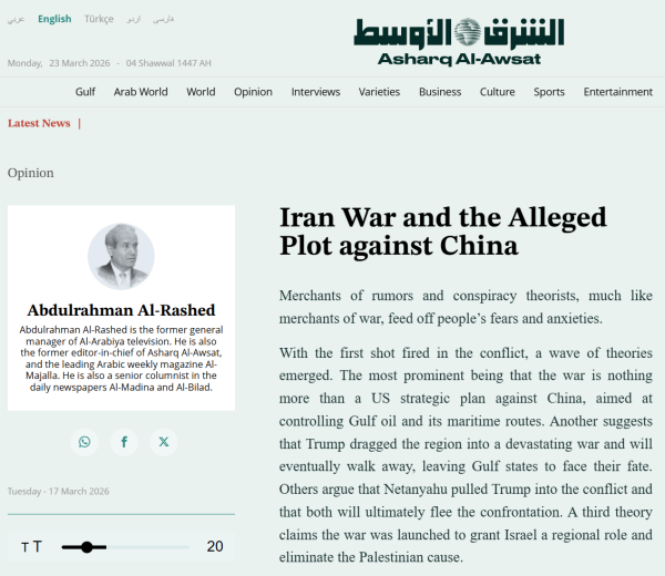 (本文原载于3月22日《中东报》网站,原标题为《伊朗战争与所谓的反华阴谋论》)