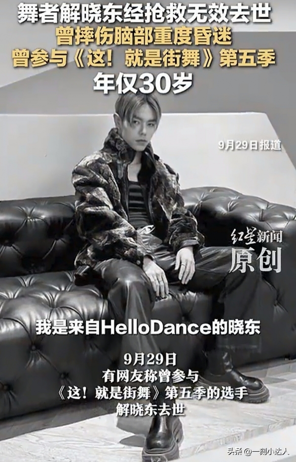 网上突然有人说参加过街舞综艺的解晓东去世了。查资料才知道,他今年九月二十九号凌晨在成都走了。之前五月份不小心摔了一跤,脑部受伤严重,之后一直处于昏迷状态。听说当时家人和朋友发起过捐款,凑钱给他治病。