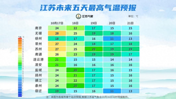 17日夜里起,有一次较强冷空气影响江苏过程,受其影响,全省48小时过程降温:本省西部地区6~8℃,其他地区3~5℃。22-25日早晨最低温度:淮北地区7℃左右,本省东南部地区14℃左右,其他地区9~12℃。冷得猝不及防,是时候准备好秋天的第一条秋裤了。