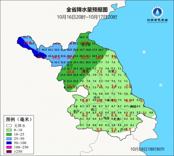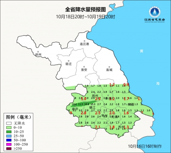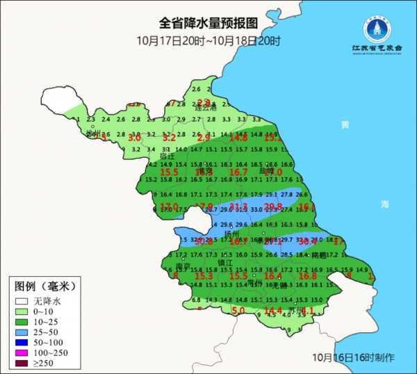 此外,未来三天江苏多阴雨天气。冷空气带来大幅降温的同时,还需关注大风影响。江苏省气象台16日下午发布海区大风黄色预警:预计17日夜间至22日,南通海区、盐城海区和连云港海区将出现阵风9级的偏北大风。请注意防范!