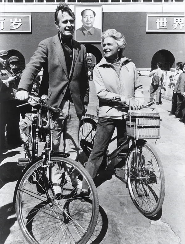 在来到心心念念的中国后,老布什立马买了两辆自行车,带着妻子畅游北京的大街小巷,仿佛一对到此旅游的情侣。