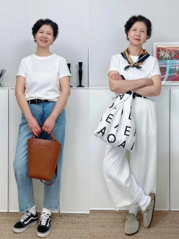 在搭配上,T恤也是百搭单品。无论是搭配牛仔裤、短裤还是半身裙,都能展现出不同的风格。这种灵活多变的搭配方式,让上了年纪的女人在夏天也能穿出属于自己的风采。