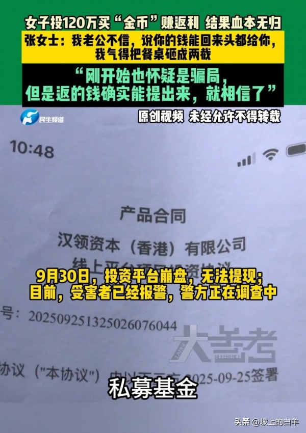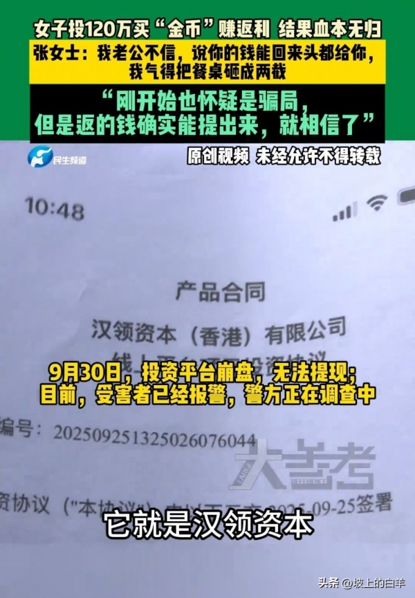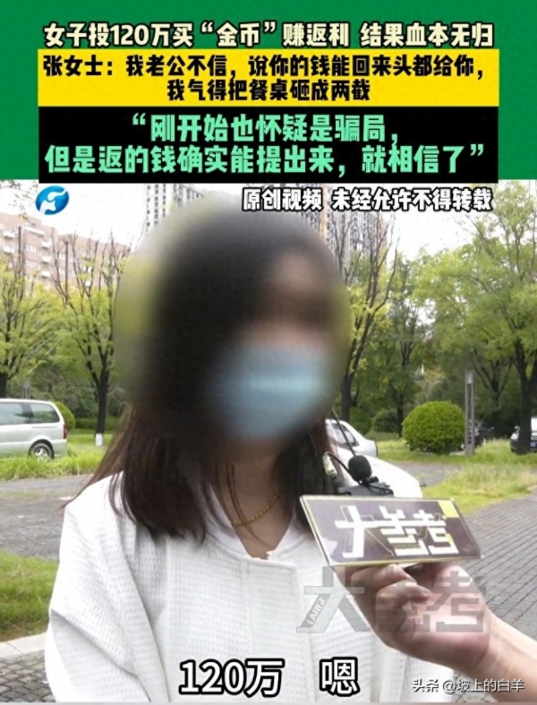 10月3日,这是个让郑州的张女士终生难忘的日子!因为她辛苦攒下的120万元在这天彻底打了水漂。事情还得从几个月前说起,当时张女士在朋友的介绍下接触到一个所谓的"金币"投资平台。平台给出的回报承诺得相当诱人,说是只要投入本金,就能在短时间内获得高额返利。听到这样的好事,张女士自然心动了。