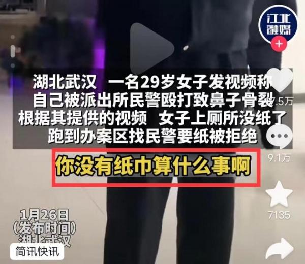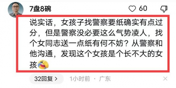 民警一听愤怒了:"你没纸巾算什么事啊?你没有纸巾跟警 察有什么关系啊?跟警 察有什么关系?我问你 ,你没有纸巾关警 察什么事?谁有这个义务给你纸巾!"