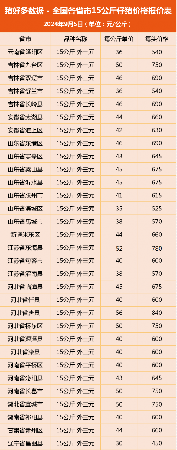 全国15公斤外三元仔猪主流价:据猪好多数据9月5日监测显示,吉林省15公斤外三元仔猪价格主流价为540-690元/头;山东省15公斤外三元仔猪价格主流价为570-675元/头;河北省15公斤外三元仔猪价格主流价为625-750元/头;江苏省15公斤外三元仔猪价格主流价为570-705元/头;河南省15公斤外三元仔猪价格主流价为600-750元/头;湖北省15公斤外三元仔猪价格主流价为625-705元/头;云南省15公斤外三元仔猪价格主流价为550-600元/头。整体来看,华北地区价格较高,西南地区价格较低。