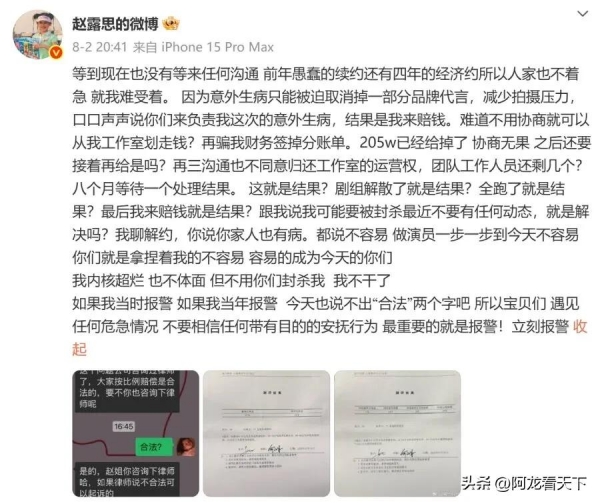 8月2日晚上,她又发长文锤经纪公司银河酷娱,晒心理测评,说是重度焦虑+重度抑郁,还直说等沟通等不到,有代言因意外生病取消,违约金自己掏。