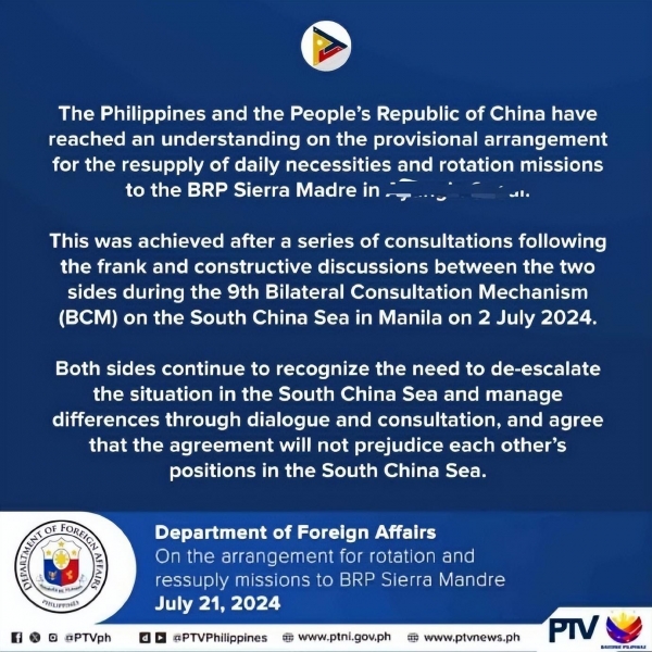 对此,菲律宾很快做出了反应,开始与中国谈判关于仁爱礁"坐滩"破船的处理方案。菲律宾外交部发布最新公告称,菲方已经与中方就日常用品补给的临时安排达成了谅解,这是在7月2日于马尼拉举行的第九次南海双边磋商机制会议期间、双方进行了坦诚和建设性的讨论后,经过一系列磋商达成的。