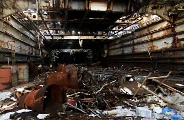 (仁爱礁"坐滩"破船的内部早已破败不堪)