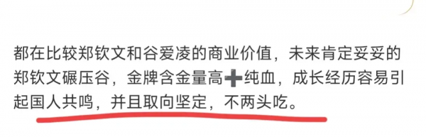 黑粉拿放大镜看这个细节,给出的解说就是--谷爱凌怕郑钦文抢她在名利场上的商务资源。
